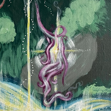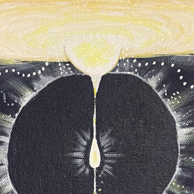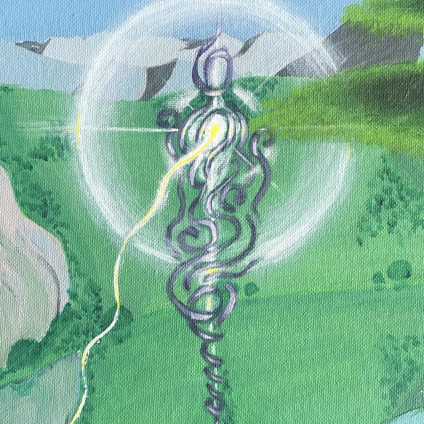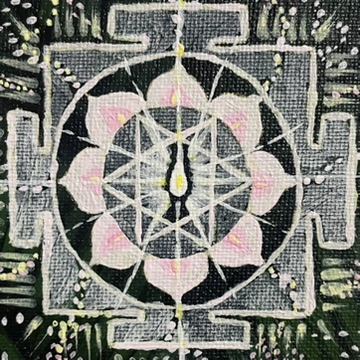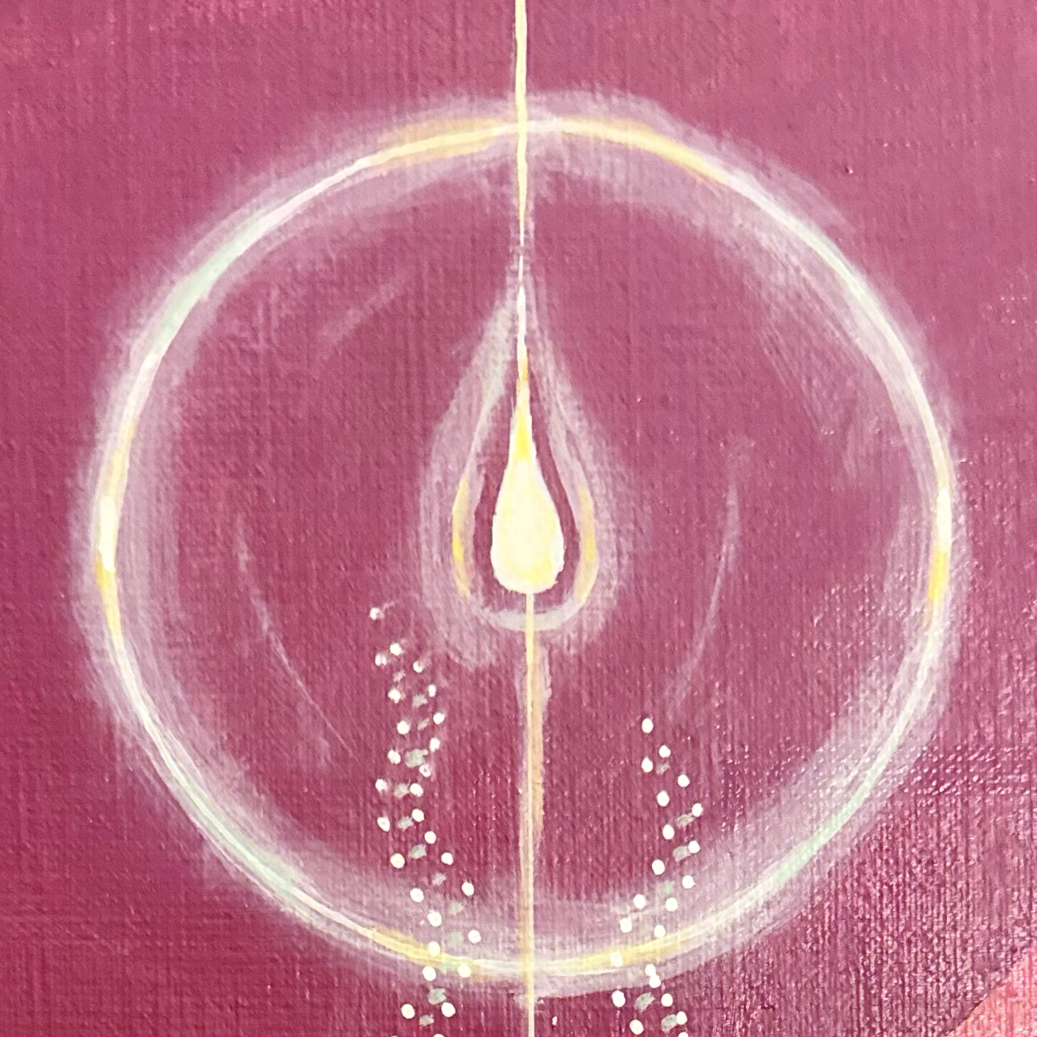 Si vous me formulez une demande spécifique, un mouvement unique se crée, un cercle vivant entre vous, moi et le Divin. Dans chaque peinture cette notion de cercle est présente car les éléments que vous choisissez sont le reflet de votre interaction avec le divin. J'interviens dans cette boucle pour matérialiser l'image.
