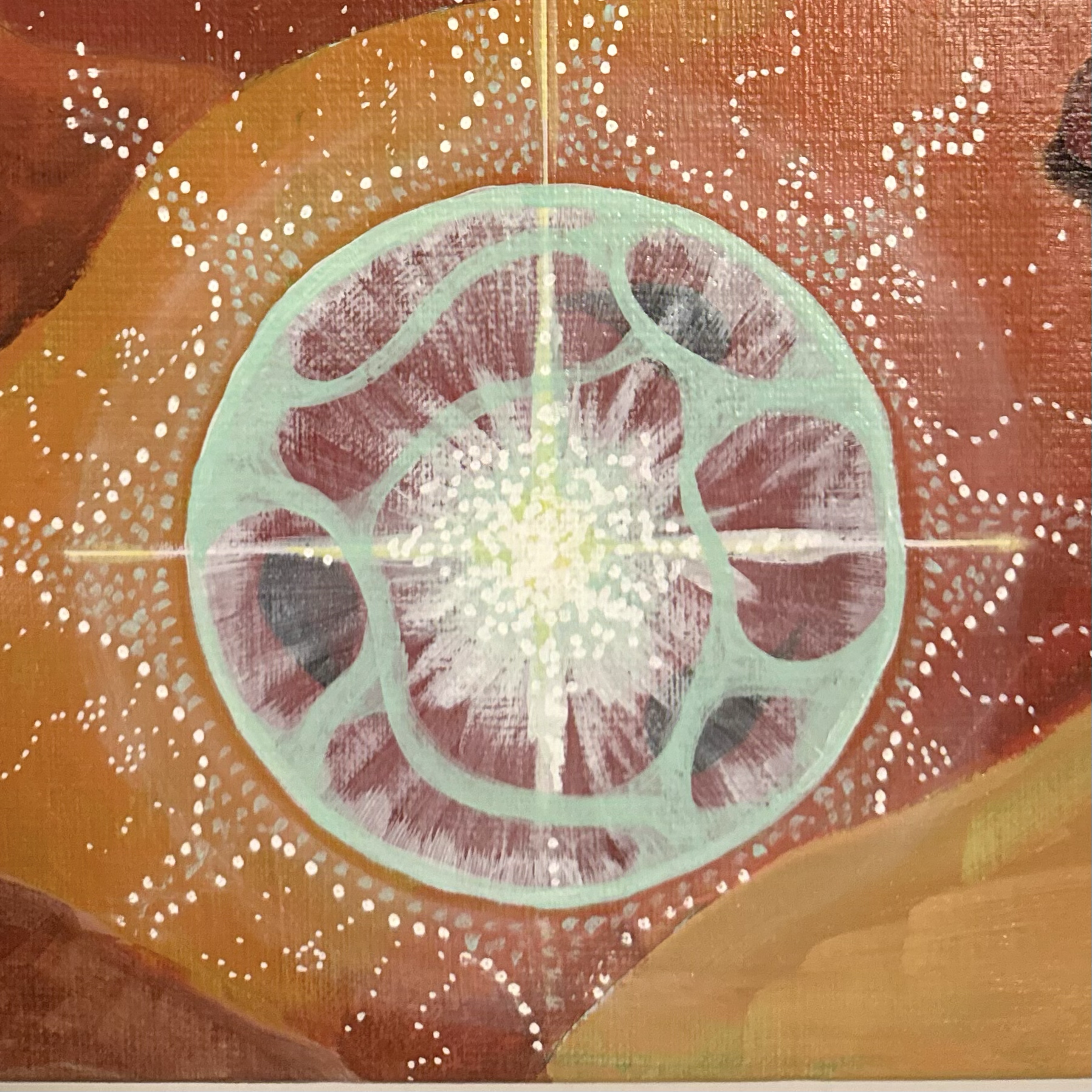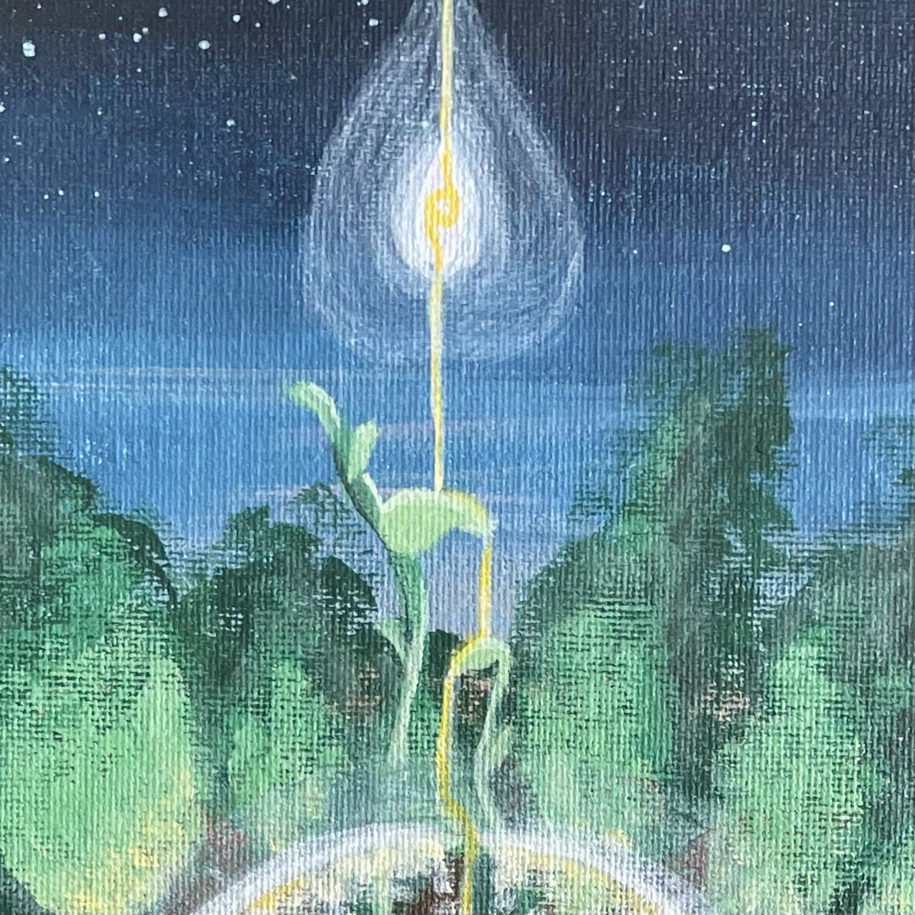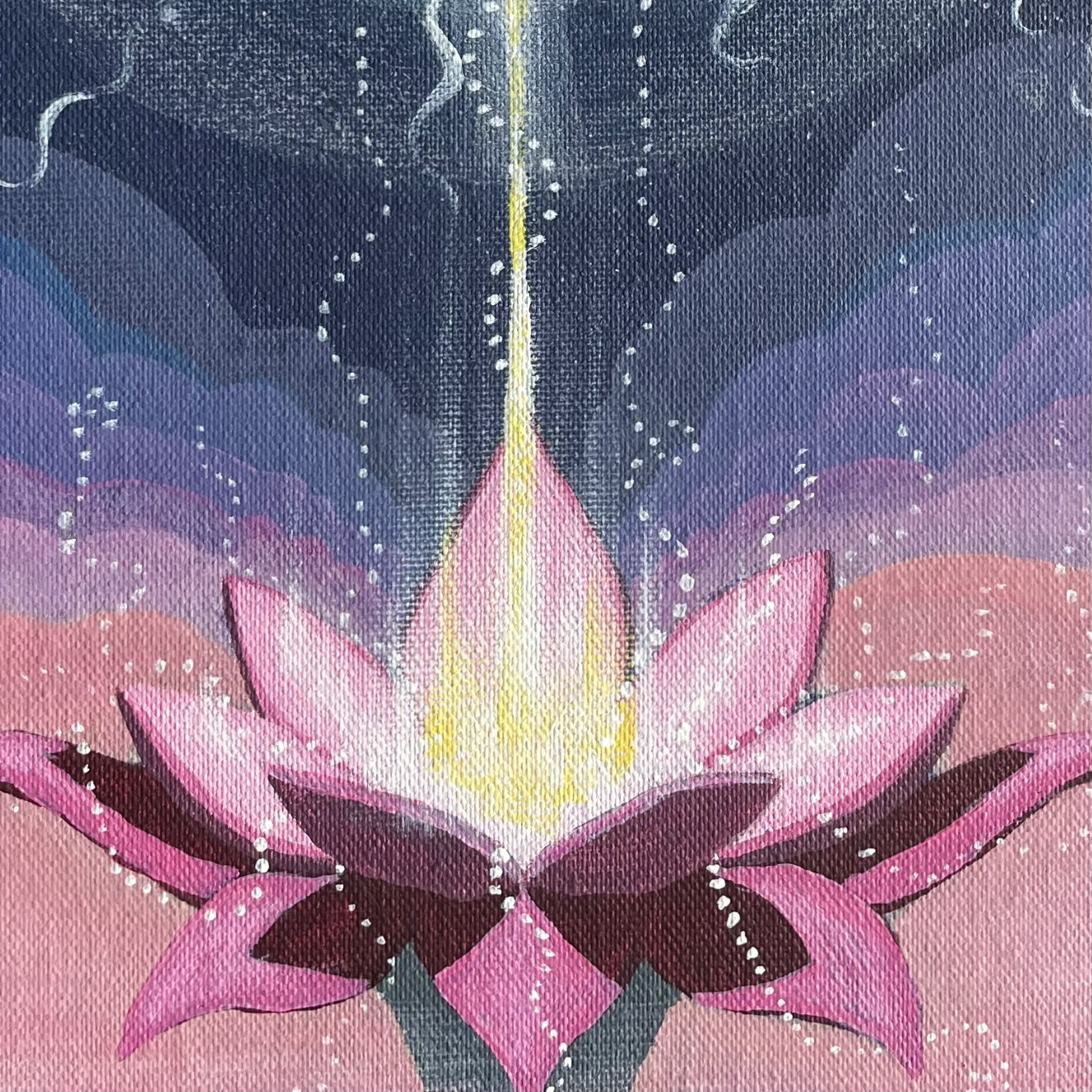Si vous me formulez une demande spécifique, un mouvement unique se crée, un cercle vivant entre vous, moi et le Divin. Dans chaque peinture cette notion de cercle est présente car les éléments que vous choisissez sont le reflet de votre interaction avec le divin. J'interviens dans cette boucle pour matérialiser l'image.
